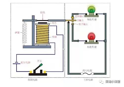 繼電器的工作原理如下圖所示。當(dāng)開關(guān)閉合時,線圈兩端加上一定的電壓,線圈中就會流過一定的電流,從而產(chǎn)生電磁效應(yīng),銜鐵就會在電磁力吸引的作用下克服回位彈簧的拉力吸向鐵芯,從而帶動銜鐵的動觸點與靜觸點(常開觸點)吸合,此時紅色燈泡亮起。當(dāng)線圈斷電后,電磁的吸力也隨之消失,銜鐵就會在彈簧的反作用力下返回原來型的位置,使動觸點與靜觸點(常閉觸點)吸合,此時綠色燈泡亮起。這樣吸合、釋放,從而達到了在電路中的導(dǎo)通、切斷的目的。
